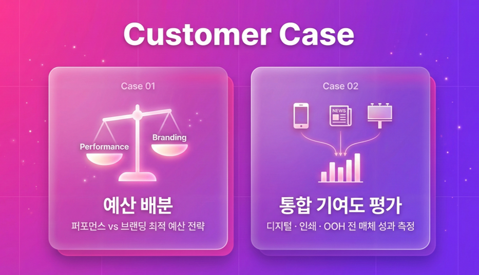 VIPer는 단순 분석을 넘어, 수년간 쌓아온 MMM 분석 경험을 바탕으로 비즈니스 의사결정을 위한 인사이트를 제공합니다. 여기 VIPer를 활용한 캠페인 사례 중 퍼포먼스·브랜딩 광고의 매출 기여도를 입증한 사례와, 3년간의 캠페인 데이터를 분석해 디지털, 인쇄, OOH 등 다양한 매체의 광고 기여도를 평가한 VIPer 프리미엄 컨설팅 고객 사례 2건을 공개합니다. 마케팅 성과를 수치로 측정하고 데이터 기반의 전략적 의사결정을 시작하고 싶다면, 아래 버튼을 클릭해 VIPer의 캠페인 성과 평가 사례를 확인해 보세요!