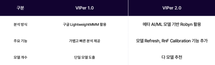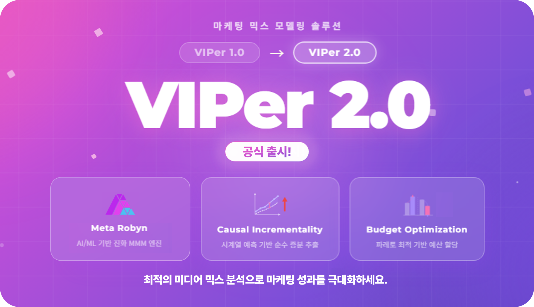 기존 Google LightweightMMM 기반의 VIPer 1.0에 이어, Meta Robyn의 진보한 예측 기술을 적용한 VIPer 2.0을 새롭게 선보입니다.