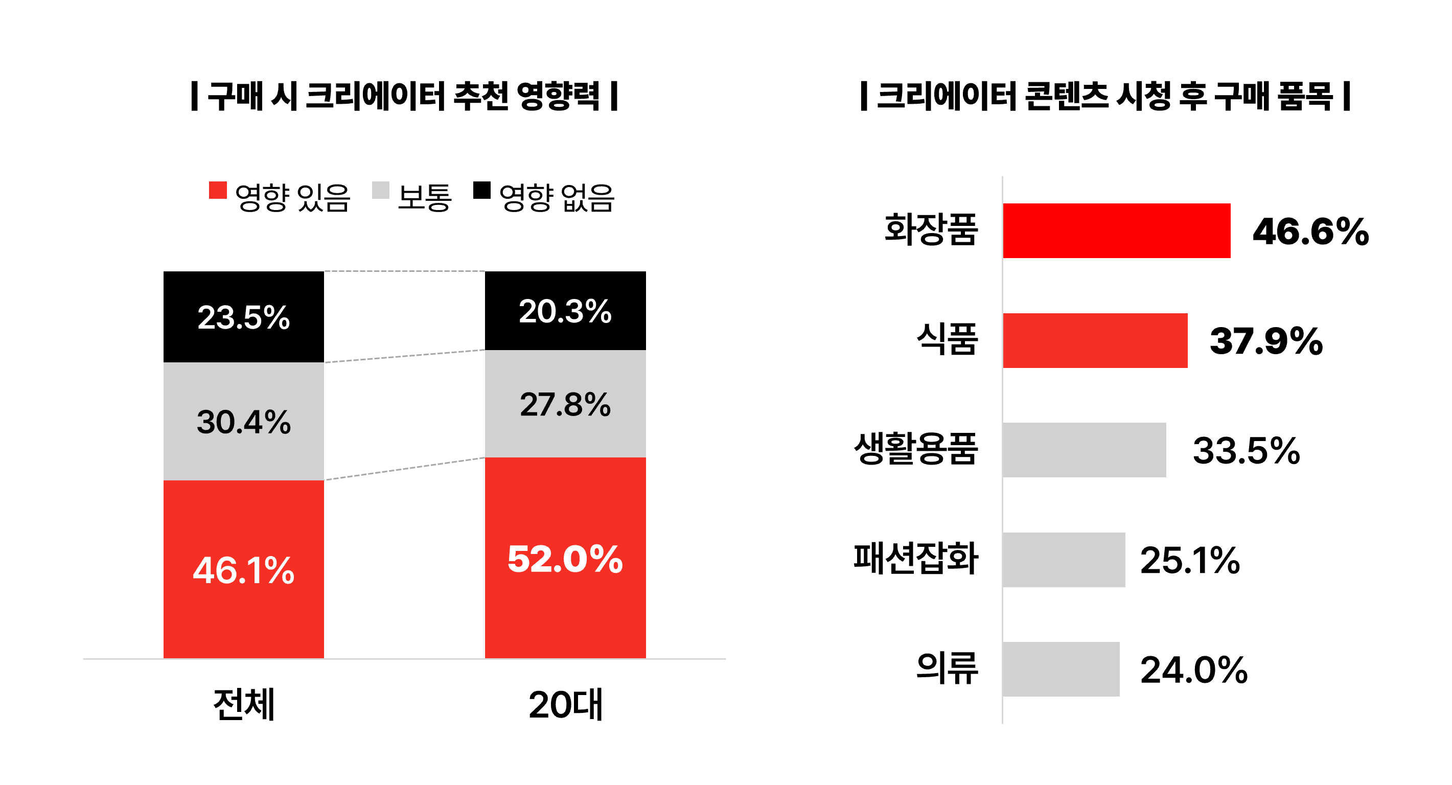 20대(52.0%)를 필두로 전 연령층에서 크리에이터의 추천이 실제 구매 결정에 강력한 영향력을 미치고 있습니다. 크리에이터 콘텐츠 시청 후 실제 구매 품목 중 화장품(46.6%), 식품(37.9%) 등 일상 품목이 압도적으로 높게 나타났는데요. 이는 크리에이터가 단순 리뷰어를 넘어 소비자의 구매 결정을 돕는 '퍼스널 쇼퍼'이자, 브랜드의 강력한 취향 발견 매개체가 되었음을 시사합니다.