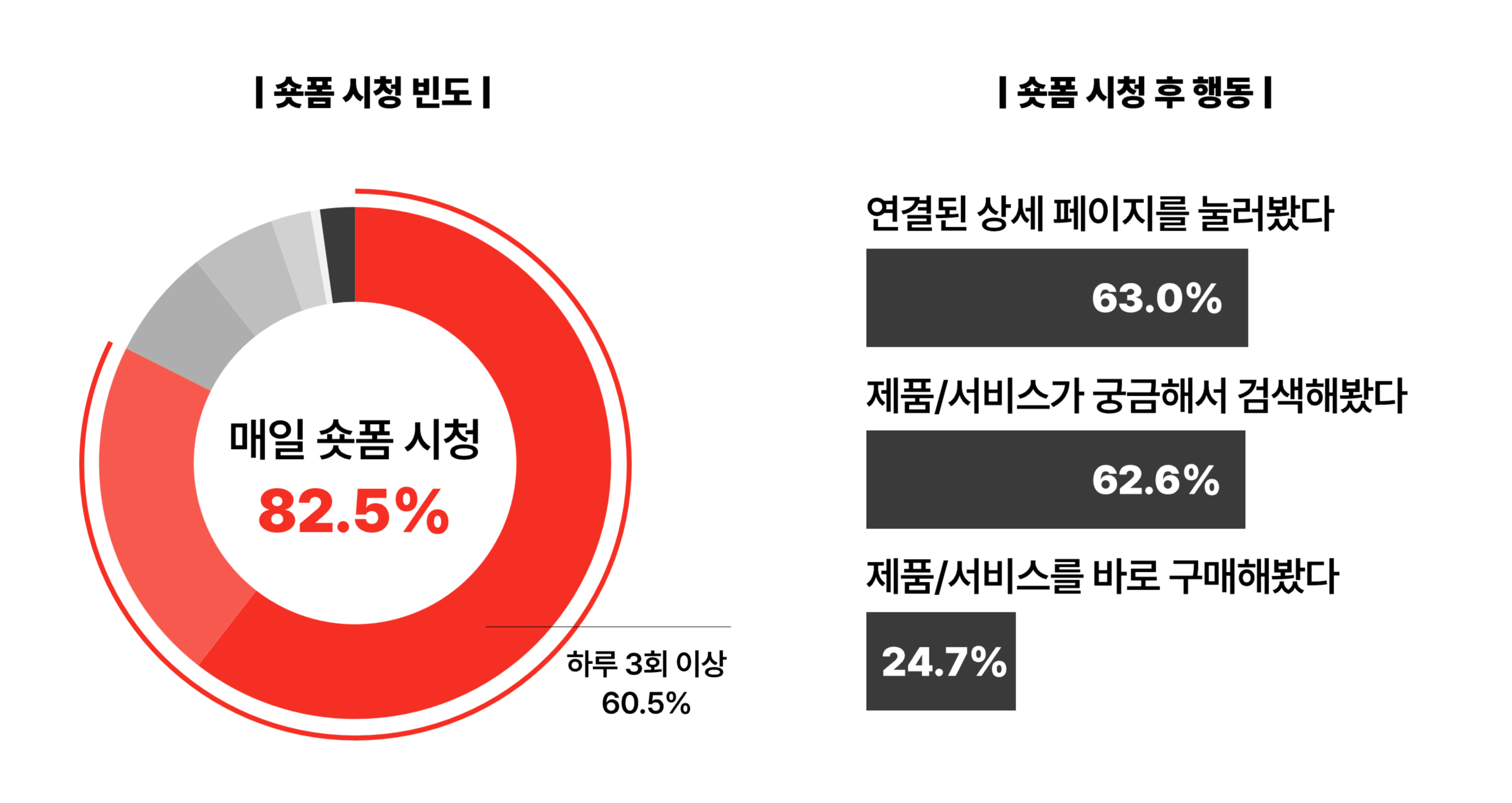 숏폼은 이제 인지부터 구매까지의 퍼널을 가장 짧게 단축시키는 강력한 채널로 진화했습니다. 이용자의 82.5%가 매일 숏폼을 시청하며, 이 중 60.5%는 하루에 3회 이상 접속할 정도로 생활의 일부가 되었죠. 특히 주목할 점은 시청 후 행동입니다. 62.6%가 제품 정보를 검색하는 것은 물론, 숏폼 시청자 4명 중 1명(24.7%)은 그 즉시 구매까지 마치는 놀라운 전환 속도를 보이고 있습니다. 이제 숏폼은 단순한 즐길 거리를 넘어, 실질적인 매출을 견인하는 '퍼포먼스 매체'로서 그 위상이 변화하고 있습니다.