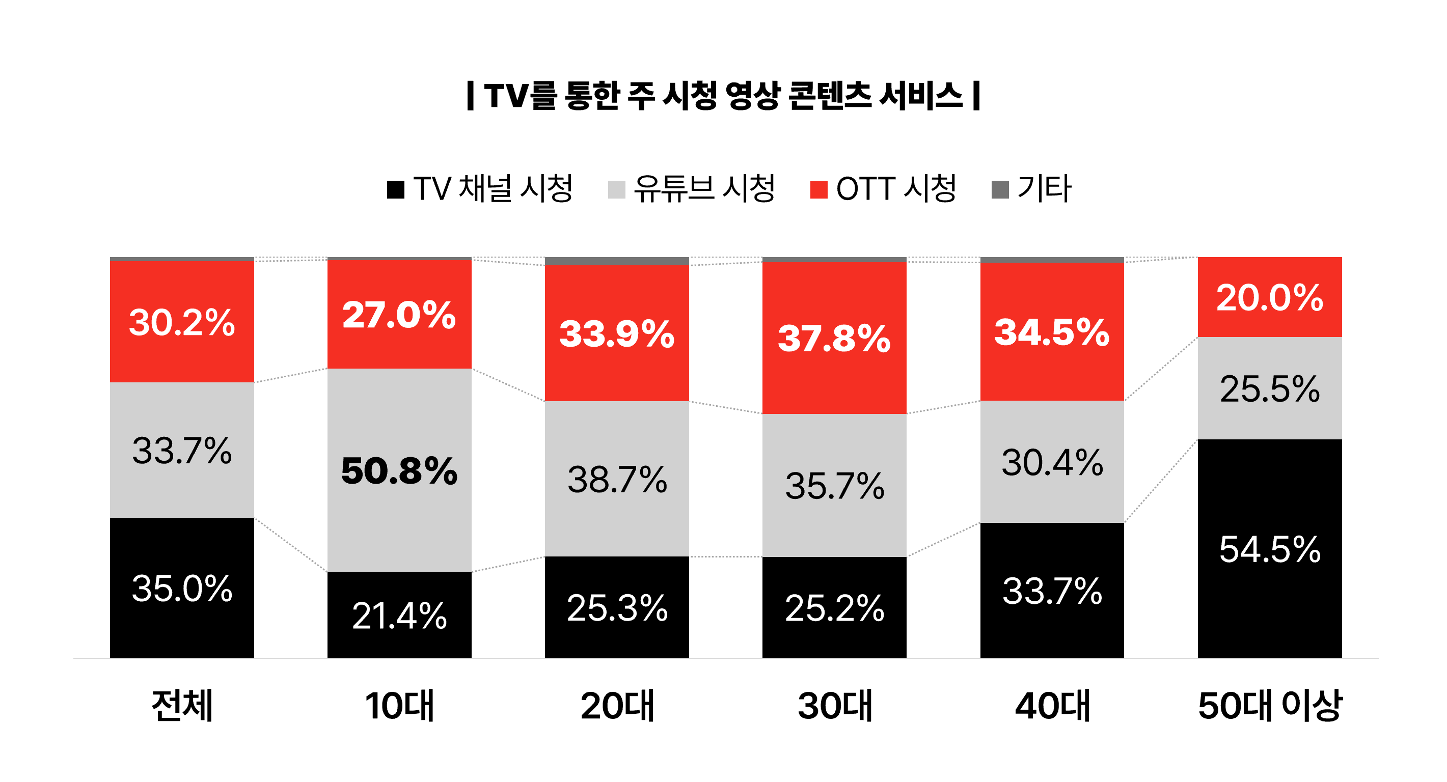 TV는 이제 실시간 방송을 수신하는 도구를 넘어, 유튜브와 OTT를 크게 즐기기 위한 콘텐츠 전용 디바이스로 완벽히 탈바꿈했습니다. 실제로 40대 이하에서는 OTT 시청이 TV 채널 시청을 이미 앞질렀으며, 10대의 유튜브 시청 비중(50.8%)은 TV 채널 시청(21.4%)보다 2배 이상 높게 나타나고 있죠. 결국 거실의 TV는 더 이상 '채널'에 갇혀 있지 않으며, 사용자가 선택한 '콘텐츠'를 송출하는 대형 디지털 스크린으로 재정의되고 있습니다.