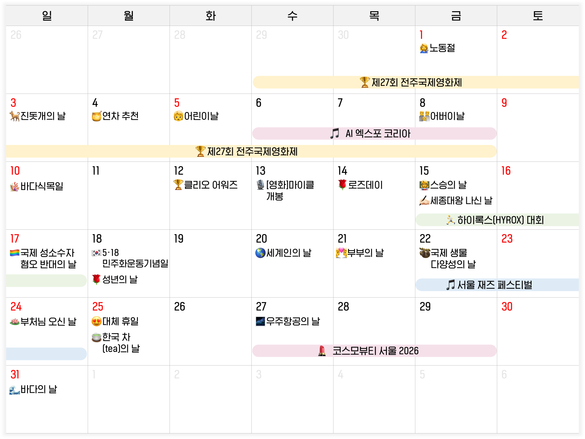 ✅ 노동절(5.1): 올해부터 '근로자의 날'에서 '노동절'로 명칭이 변경되며 법정 공휴일로 지정됐어요.