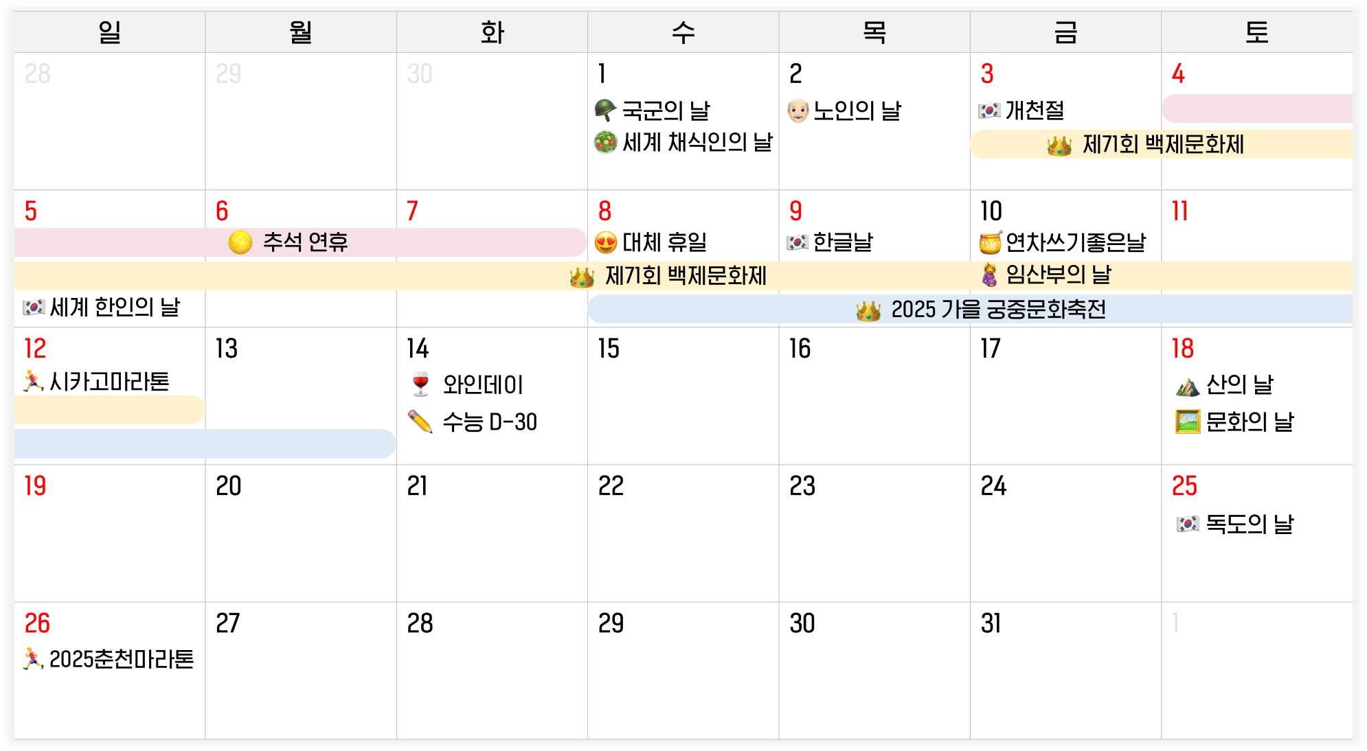 ✅ 추석 연휴(10.3 ~ 10.9) : 10월 황금연휴! 10월 10일 연차 사용하면 최대 10일 쉴 수 있어요.