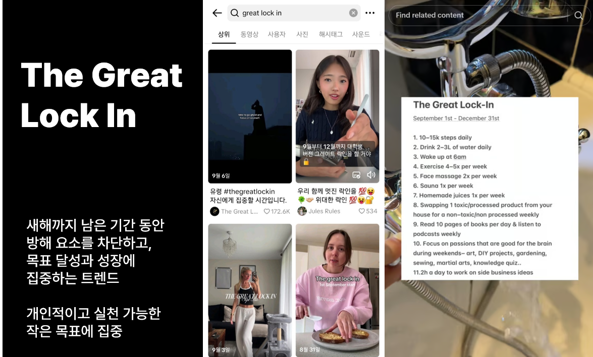 SNS에서는 '락인' 해시태그를 달며 하루 실천 인증 영상과 루틴 꿀팁을 공유하는 영상이 쏟아지며 큰 호응을 얻고 있습니다. 완벽한 계획보다 일상 속 작은 성취를 소중히 여기고, 자기 자신을 긍정하며 성장하는 문화가 MZ세대로 퍼지고 있는 것이죠. 단순한 유행을 넘어 삶의 태도에 영향을 미치는 사회문화적 현상으로 주목받는 '그레이트 락인'. 남은 올해 자신만의 작은 락인을 시작해보는 건 어떨까요?