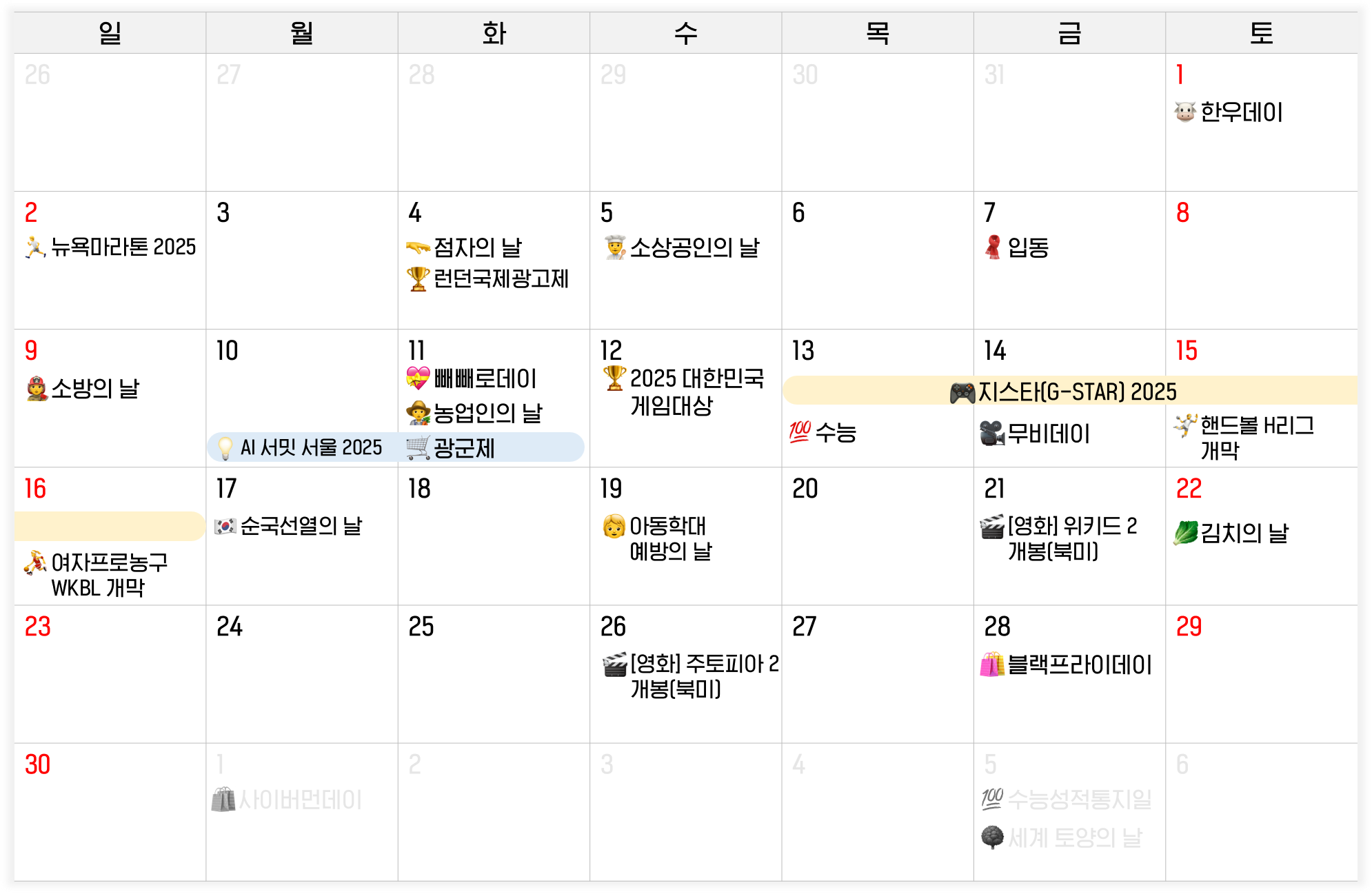 ✅ 블랙프라이데이(10.28) : 미국의 최대 할인 행사, 직구족들 주목! 국내 기업들의 할인 행사도 기대돼요. |