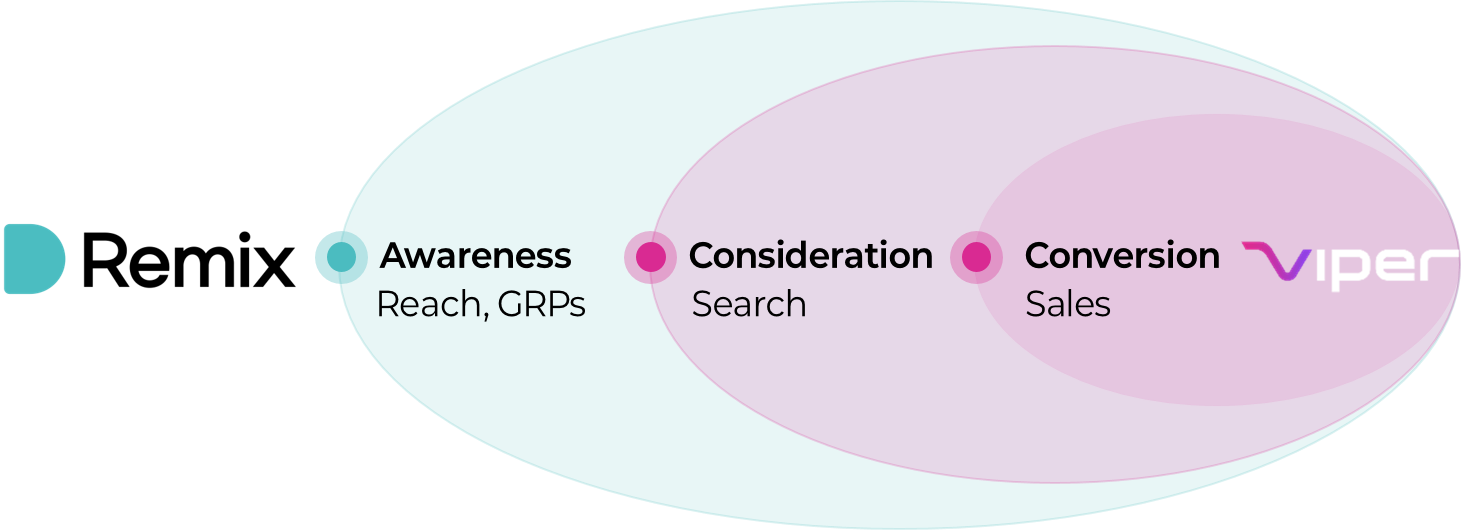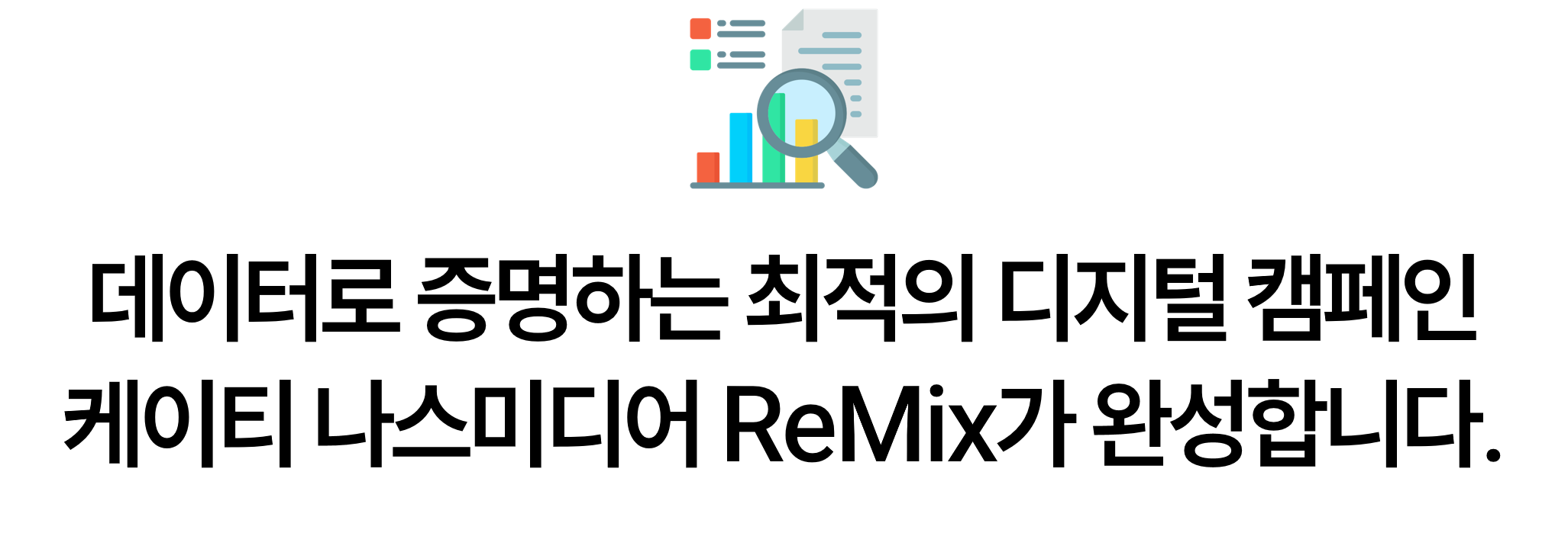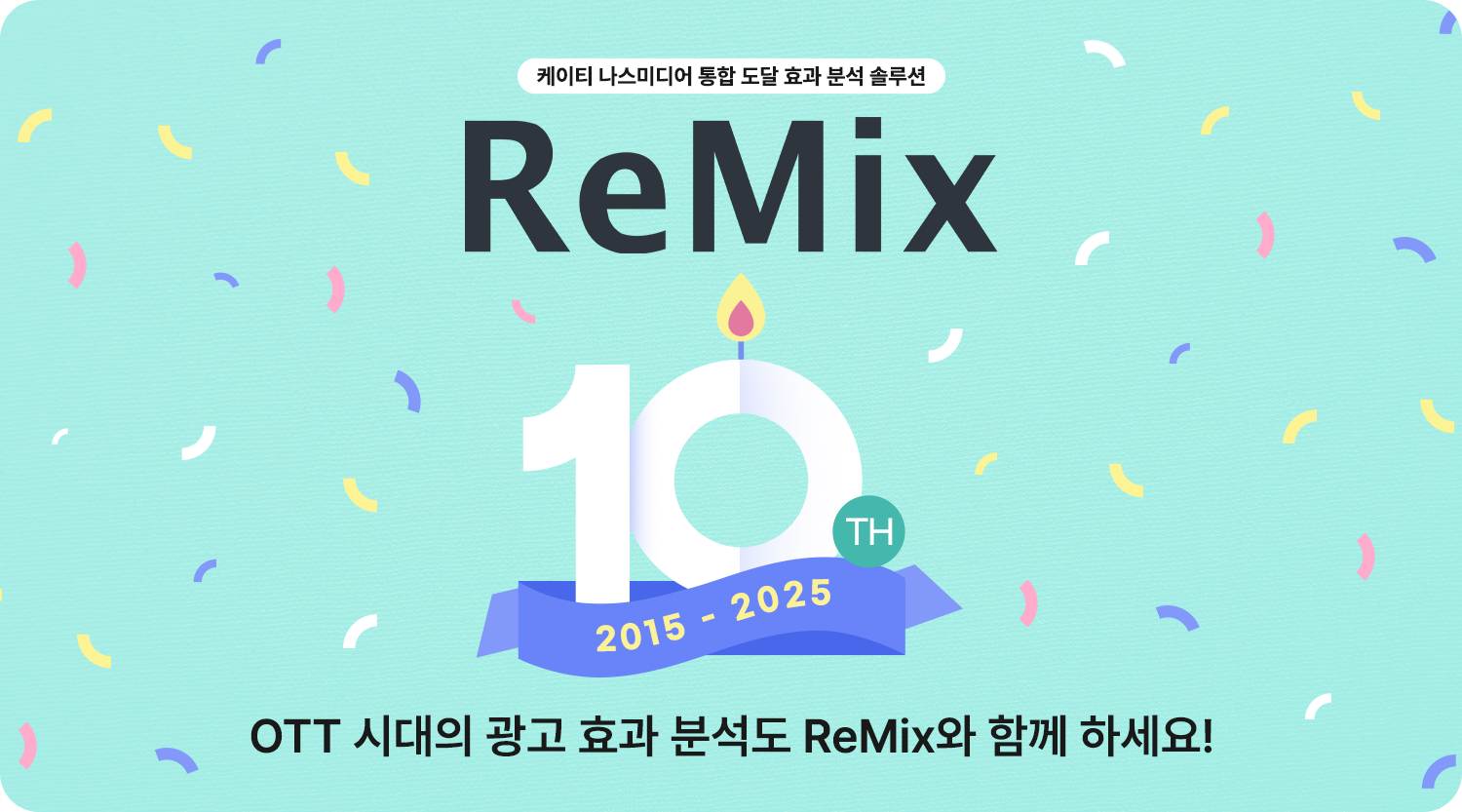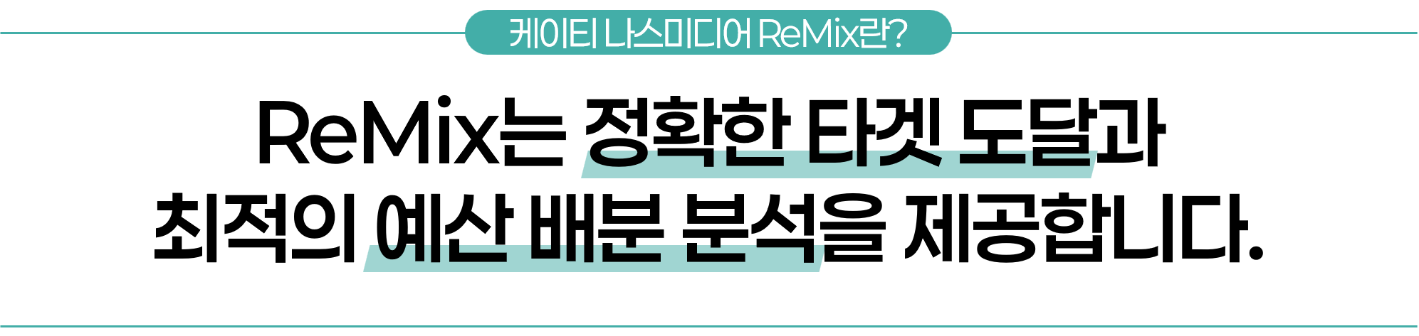 타겟 1명이 다양한 매체를 소비하는 환경에서 캠페인 성과 추정은 점점 더 어려워지고 있습니다. ReMix는 다매체 환경에서 캠페인의 통합 성과를 수치로 확인할 수 있는 최적의 솔루션입니다. 또한 케이티 나스미디어는 광고 도달 이후의 KPI(ex. 검색, 방문, 매출 등)에 대한 광고 기여도를 분석하는 VIPer(MMM: Media Mix Modeling) 컨설팅을 함께 제공하고 있습니다.