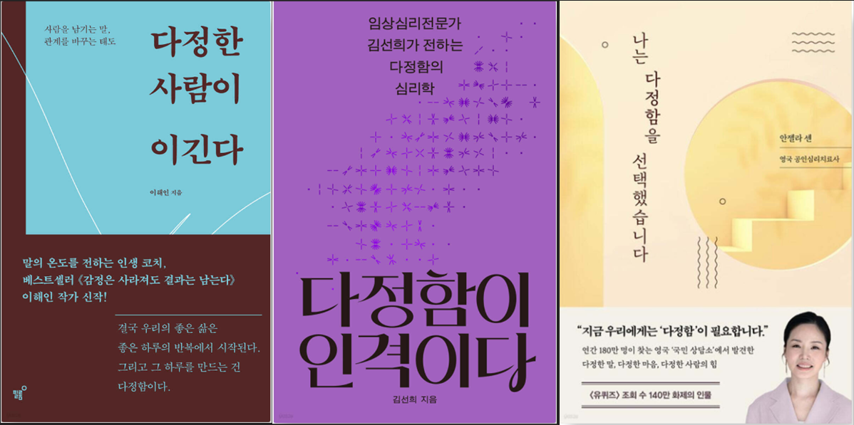 다정함은 더 이상 성격이나 기질이 아닌, 배우고 키울 수 있는 역량으로 이해되고 있습니다. Z세대는 다정함을 하나의 ‘소프트 스펙’으로 인식하며, 좋은 관계를 만들고 협업을 이끄는 기술로 받아들이고 있습니다. 출판계에서도 다정함을 주제로 다양한 책들이 출간되며, 다정함이 사회적 역량이자 리더십의 기반으로 조명되고 있죠.