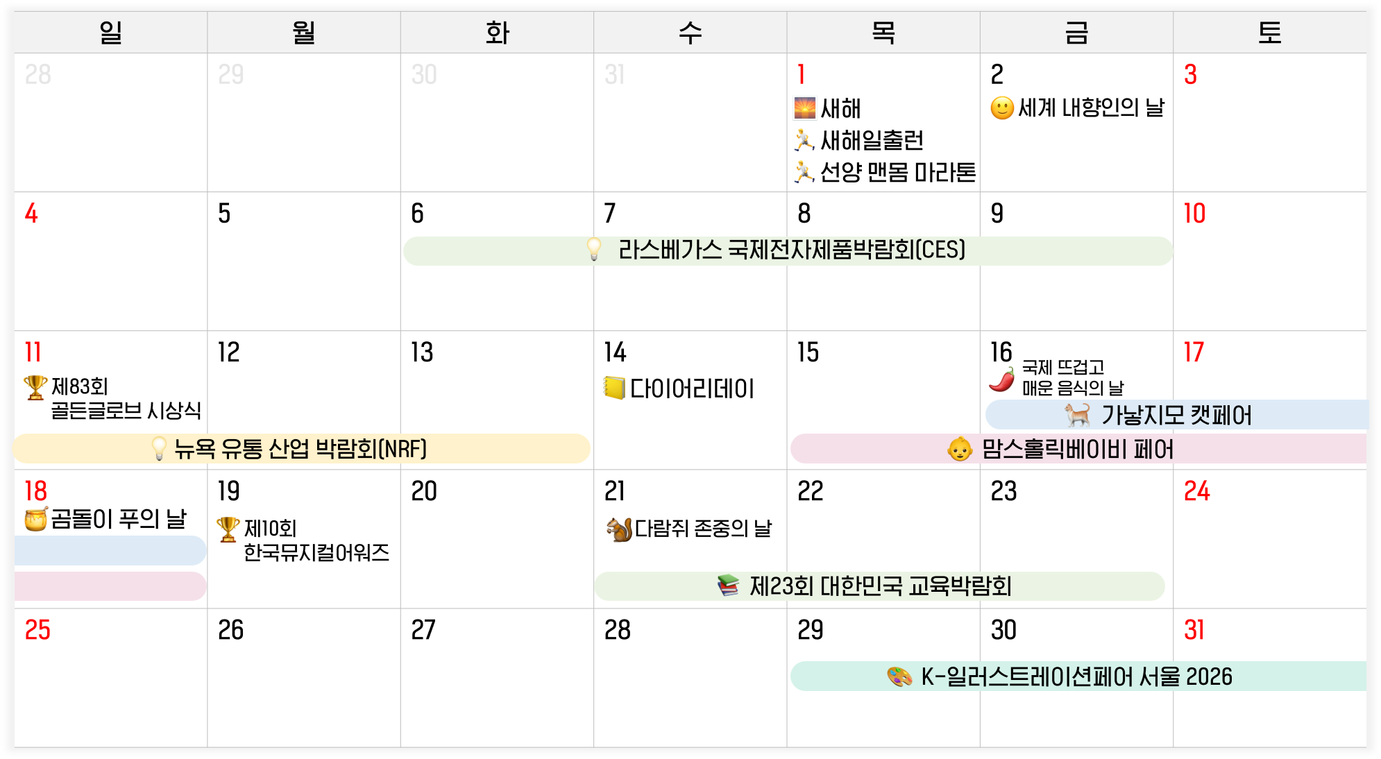 취향을 찾고, 경험을 나누고, 소비가 자연스럽게 이어지는 구조 속에서 박람회는 이제 단순한 전시가 아니라 하나의 '경험 콘텐츠'로 확실히 자리 잡고 있어요. 1월에도 국내외에서 다양한 분야의 박람회가 예정되어 있어요. 1월에 주목할 국내 박람회와, 박람회의 인기 요인을 아래 버튼을 눌러 확인해보세요.