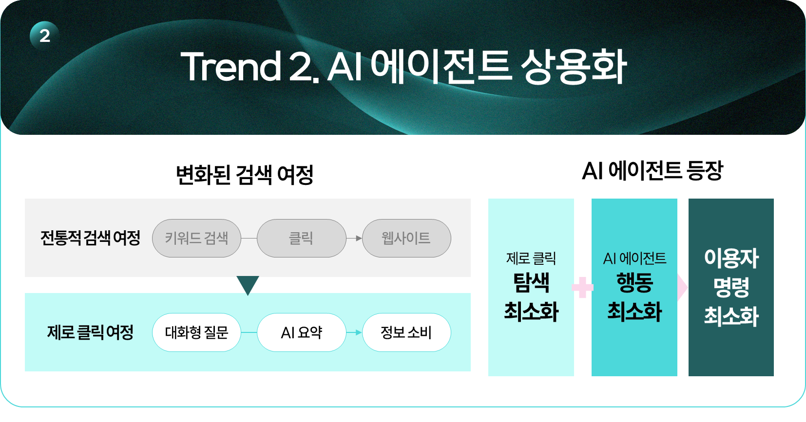 기존의 검색·탐색 방식이 크게 변하고 있습니다. 검색창에 직접 입력하고 클릭하던 흐름에서 벗어나, AI가 탐색·판단·실행을 대신해주는 ‘제로 클릭(Zero Click)’ 시대가 본격화되고 있어요. 이에 따라 ‘AI 에이전트’를 활용한 서비스가 이커머스와 광고 영역 전반에 빠르게 확산되고 있습니다.