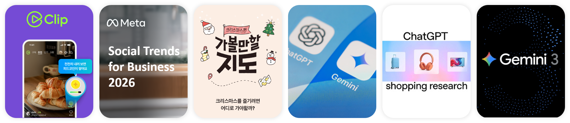 📥 [12월 주요 미디어 & 마켓 이슈] #네이버클립#메타2026트렌드발표#오픈AI#제미나이🔎 [NAS PICK.] 네이버 클립, 크리에이터와 이용자를 잇는 양방향 보상 프로그램 출시📥 [12월 매체 상품 소식] 구글, 메타, 카카오, 토스, X 광고 상품 업데이트📷 [OOH ISSUE] <임영웅> 전국 투어 콘서트 기념 지하철 5호선 래핑 캠페인 사례 소개 |